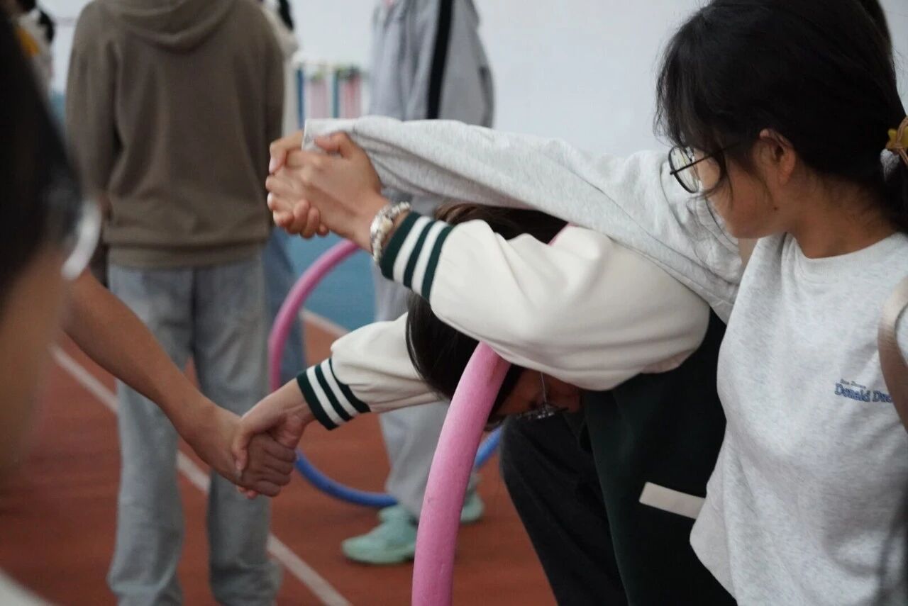 10人小队手拉手围成圆圈,呼啦圈在队员间传递,队员们互相配合,现场充满笑声与欢呼。