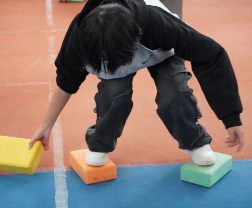 4人小队踩着瑜伽砖前进,既要保持平衡,又要注重速度。有队员失去平衡后立即起身继续,赢得观众的掌声。