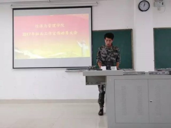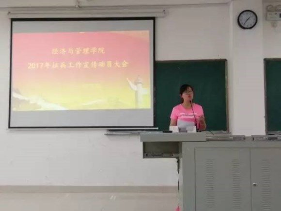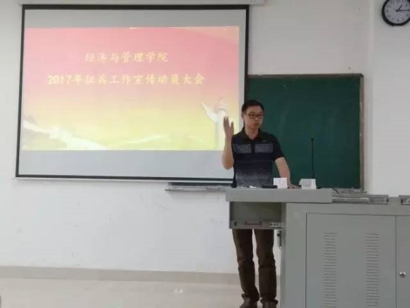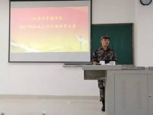 为了响应国家大学生征兵工作号召,经济与管理学院于2017年5月19日中午12:50在理科楼南112召开2017年征兵工作宣传动员大会。我院党总支副书记黄懿,正处级督导员刘传爱老师,辅导员李湘龙老师均参加了此次会议。此次动员大会由辅导员彭雁老师主持召开。