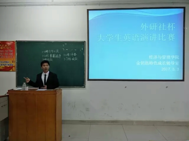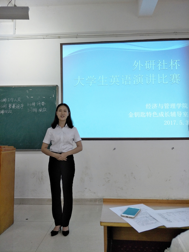 为提高大学生英语应用水平,锻炼英语口语及表达能力,营造浓厚的英语学习氛围,2017年5月3日19:00,由经济与管理学院主办,“金钥匙”特色成长辅导室承办的“外研社杯”大学生英语演讲比赛在理科楼南108拉开帷幕,辅导员李翠老师也到场观看了比赛。