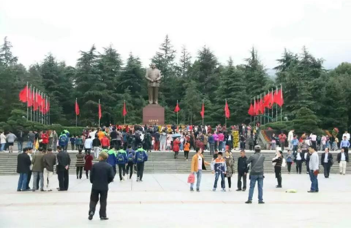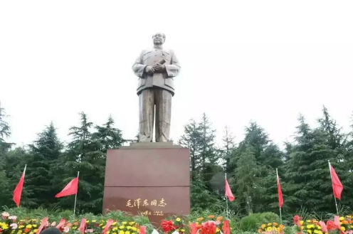 鲜红的旗帜在林木掩映下飘扬着,我们到达了毛泽东铜像广场。